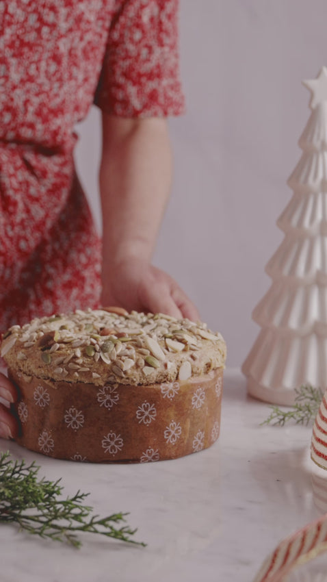 Pan de Pascua preparado con harina de almendras, huevos de gallinas libres y aceite de coco, endulzado delicadamente con alulosa. Enriquecido con un mix de frutos secos crocantes y una exquisita combinación de especias aromáticas.